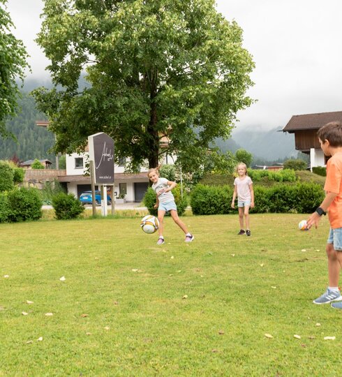 Draußen wartet ein großer Spielplatz mit Baumhaus, Kaninchengehege, eine Wiese für Badminton, Boccia, oder ihr dreht ne Runde mit dem Mini-Quad!