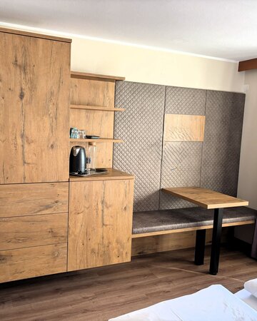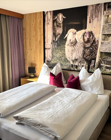 It´s in the newly refurbished heritage building.This double room features a cozy chaiselounge, a small seating area with a table, and a balcony with a stunning mountain view – the ideal spot to unwind and relax.