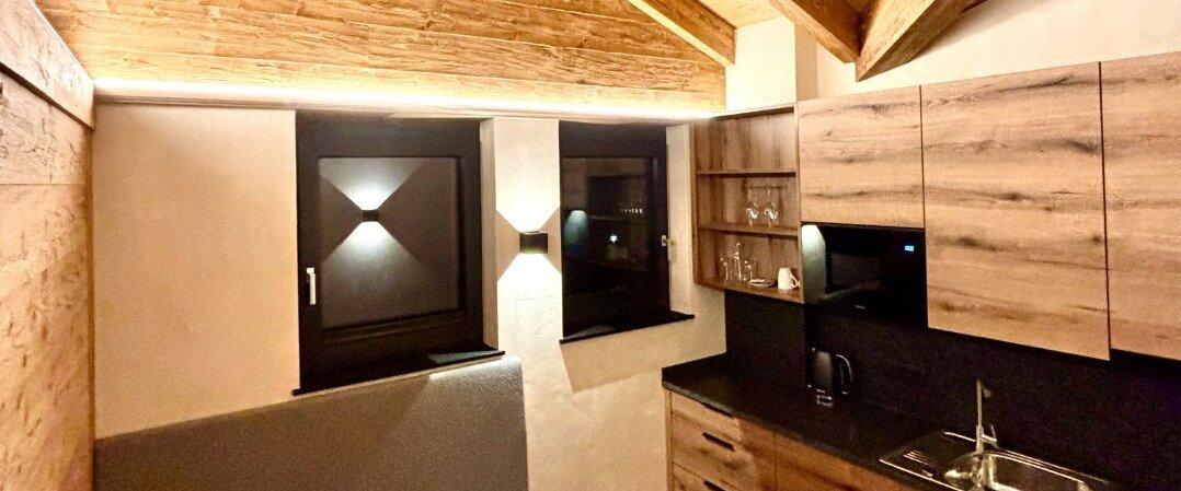Die private Küche – ausgestattet mit Ceranfeld, Mikrowelle und Kühlschrank – bietet euch maximale Flexibilität, ob für kleine Snacks zwischendurch oder gemeinsame Mahlzeiten im Familienkreis. Der traditionelle Sichtdachstuhl verleiht der Suite alpine Gemütlichkeit und schafft ein unverwechselbares Ambiente.